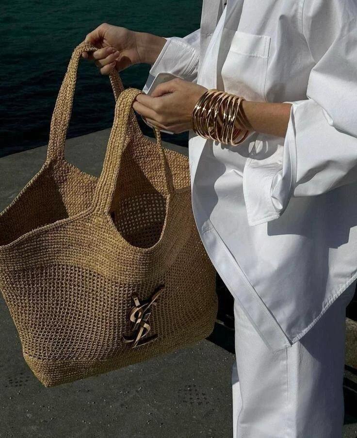 YSL - Sac porté épaule en raphia à finitions en cuir Manon Mini