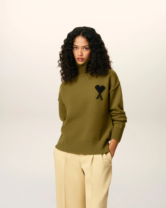 Ami Pull Kaki Col Cheminée En Laine Bronze Noir
